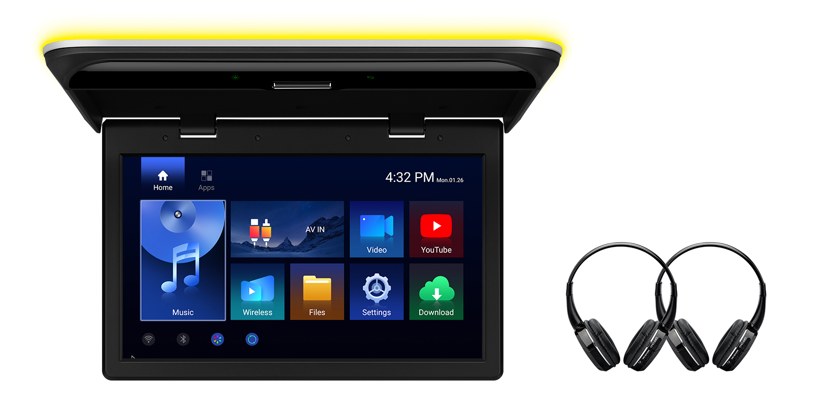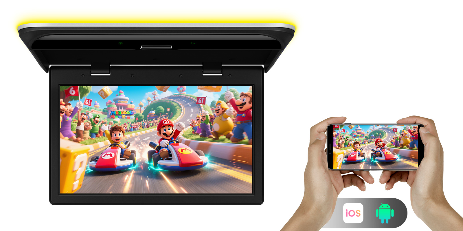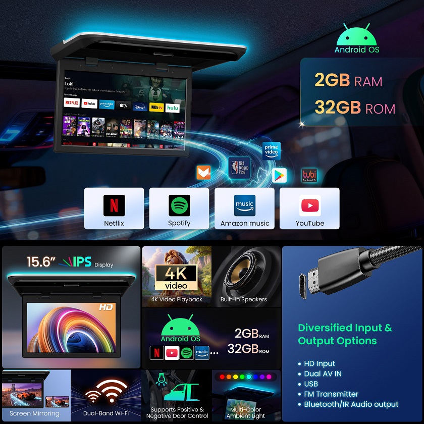 当社のAndroid搭載フリップダウンモニターを使えば、後席の乗員がNetflix、YouTube、Spotifyを直接ストリーミング再生できます。2GB RAMと32GB ROMを搭載しているため、スマートフォンのようなスムーズさで、あらゆるアプリのダウンロード、USBファイルの再生、WiFiブラウズ、コンテンツのワイヤレスミラーリングが可能です。