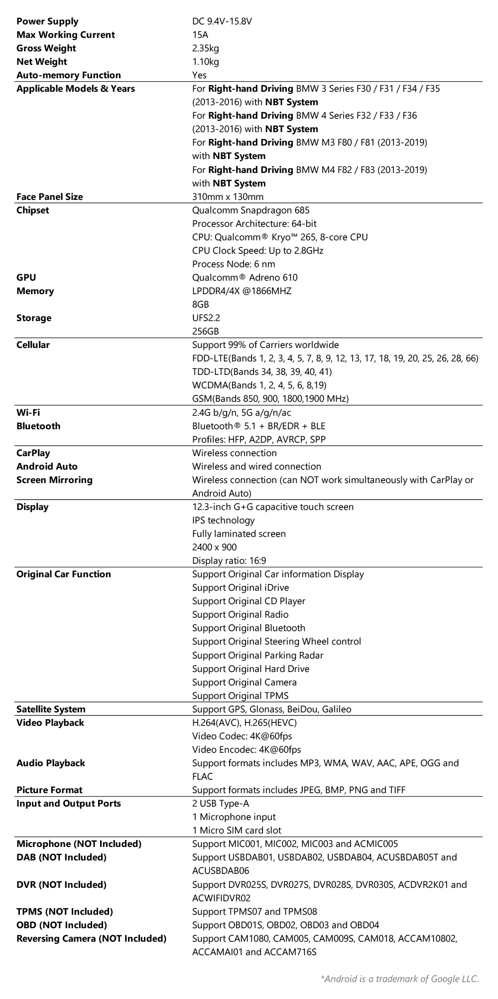 12.3 “十分に全体的な 4G ネットワーク、無線 CarPlay、フル装備のアンドロイド自動、NBT システムが付いている BMW 3/4 のシリーズ /M3 /M4 のための 4K ビデオ プレーバック、習慣適合のための作り付け QHD 2K IPS スクリーンのアンドロイド 14 オクタ中心 64Bit Qualcomm 685 のプロセッサ 8GB + 256GB ROM 車のマルチメディアのナビゲーション・システム