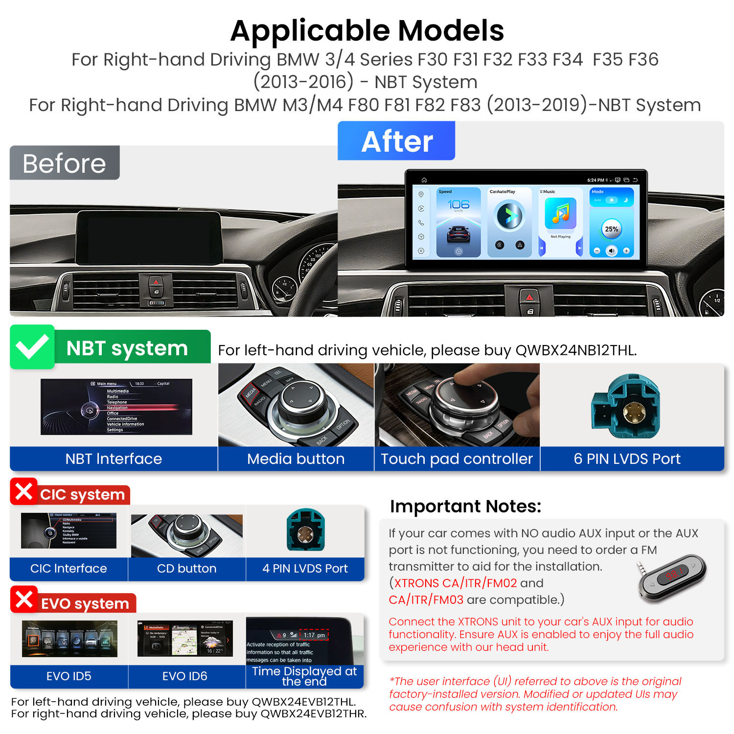 1.このユニットは、オリジナルのBMW NBTシステムでのみ動作します。NBTシステムのカーラジオには通常、メディアボタン、タッチパッドコントローラー、6ピンLVDSポート、BMW NBTインターフェースが付属しています。