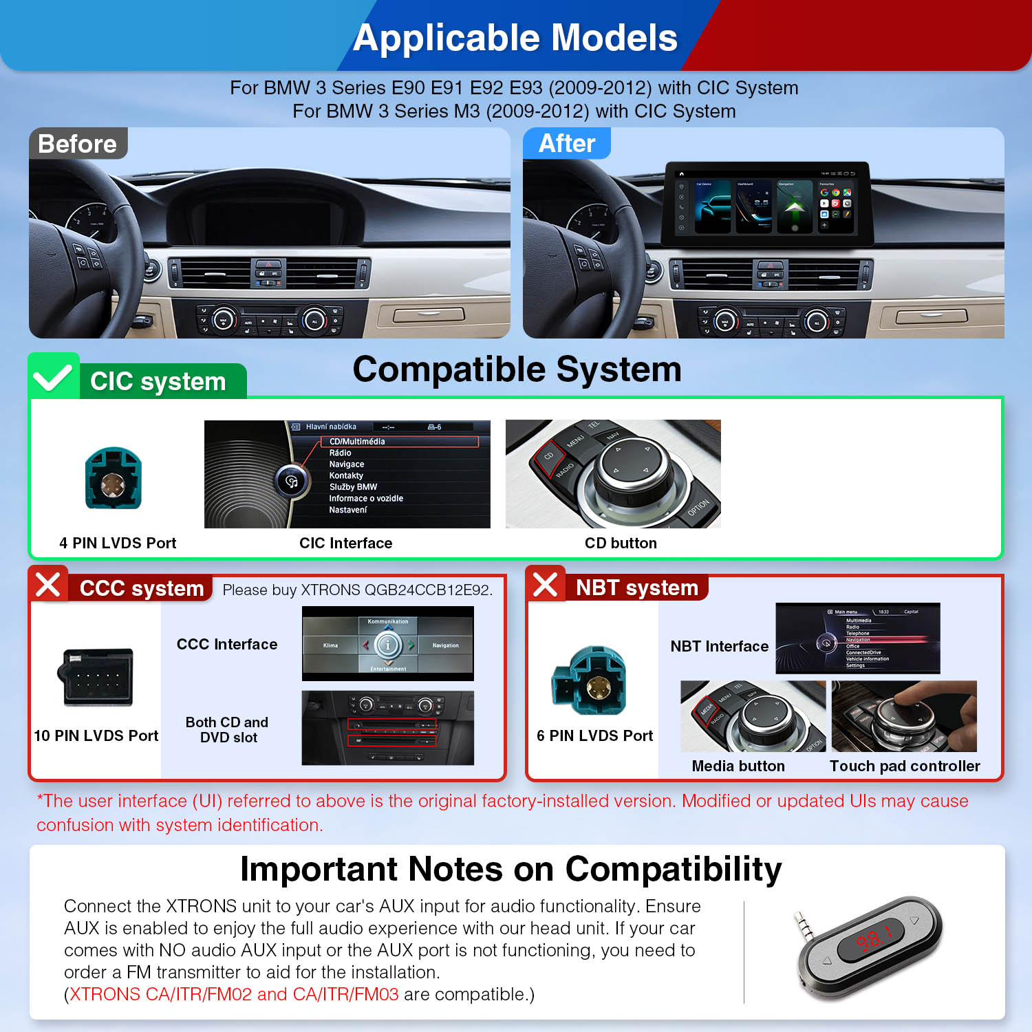 1.このユニットは、BMW純正CICシステムでのみ動作します。 CICシステムのカーラジオには通常、CDとDVD用の独立したスロット、10ピンLVDSポート、BMWカー・コミュニケーション・コンピューター・インターフェースが装備されている。
