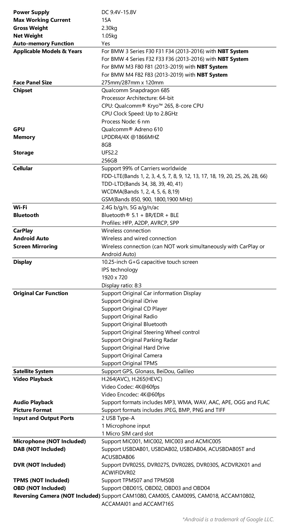 BMW|3シリーズ/4シリーズ/M3/M4|アンドロイドOS&OEMシステム|クアルコム685|オクタコア|8GB RAM&256GB ROM|QWBX14NBTH