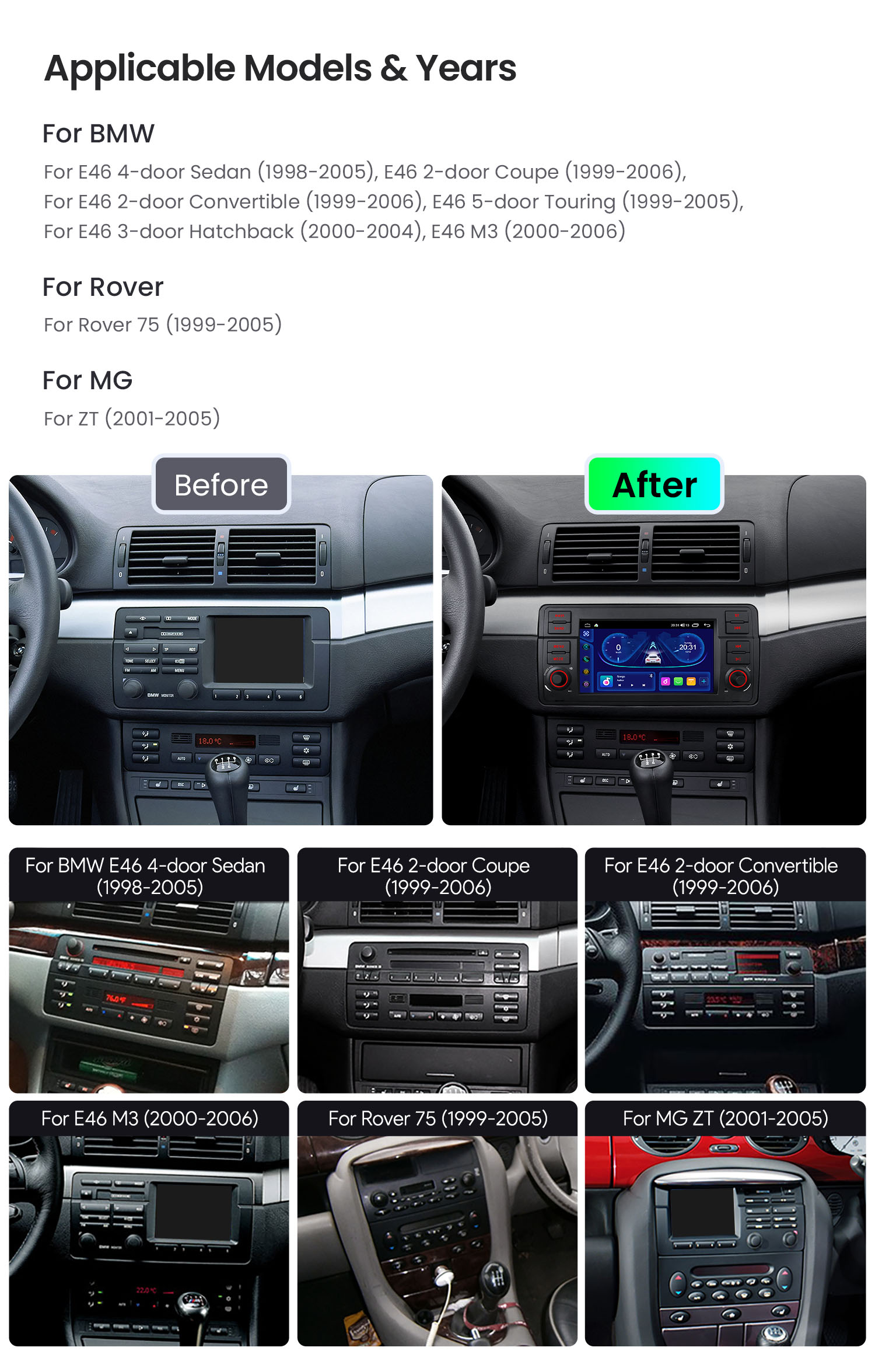 BMW E46 のための 4 ドア セダン(1998-2005 年)、E46 2 ドア クーペ; (1999-2006 年)、E46 2 ドア コンバーチブル(1999-2006 年)、E46 5 ドア ツーリング(1999-2005 年)、E46 3 ドア ハッチバック(2000 年- 2004 年)、E46 M3 (2000-2006 年)