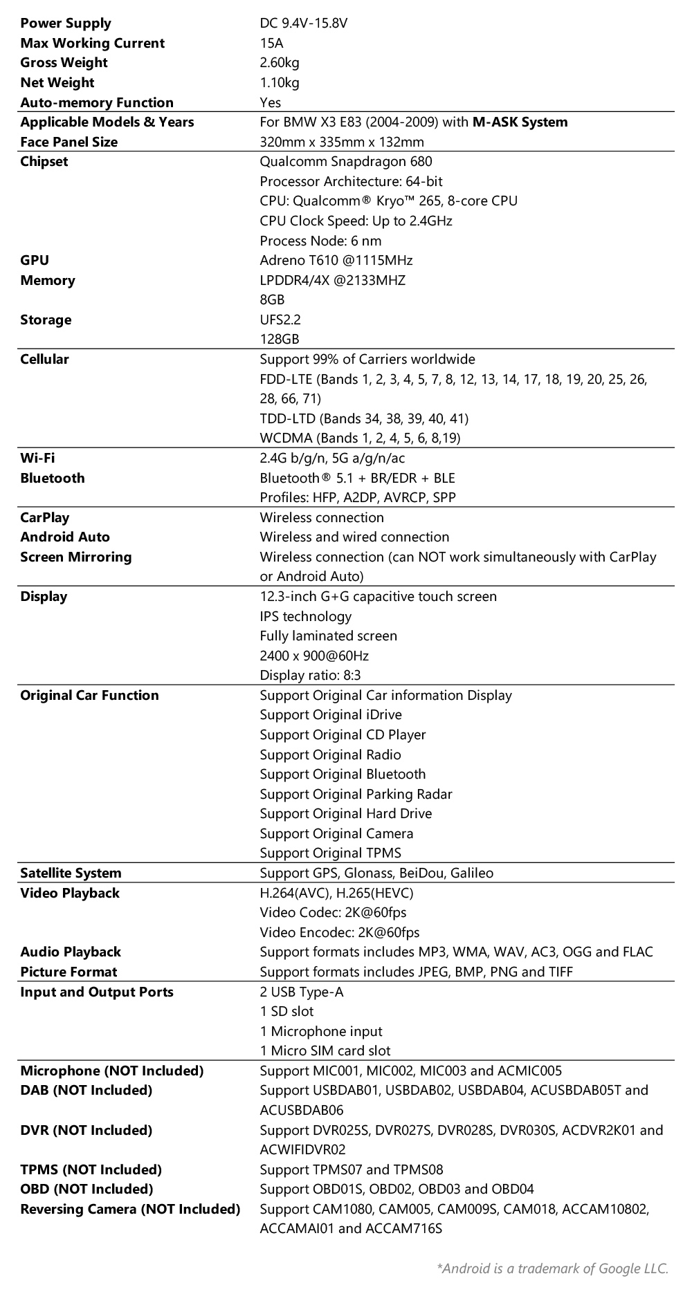 12.3 “完全に薄板にされた 2K IPS スクリーン アンドロイド 14 オクタ中心 64Bit Qualcomm 680 プロセッサ 8GB + 128GB ROM M-ASK システムが付いている BMW X3 E83 のための無線 CarPlay/Full-featured のアンドロイド自動車の習慣適合作り付け 4G の車のマルチメディアのナビゲーション・システム