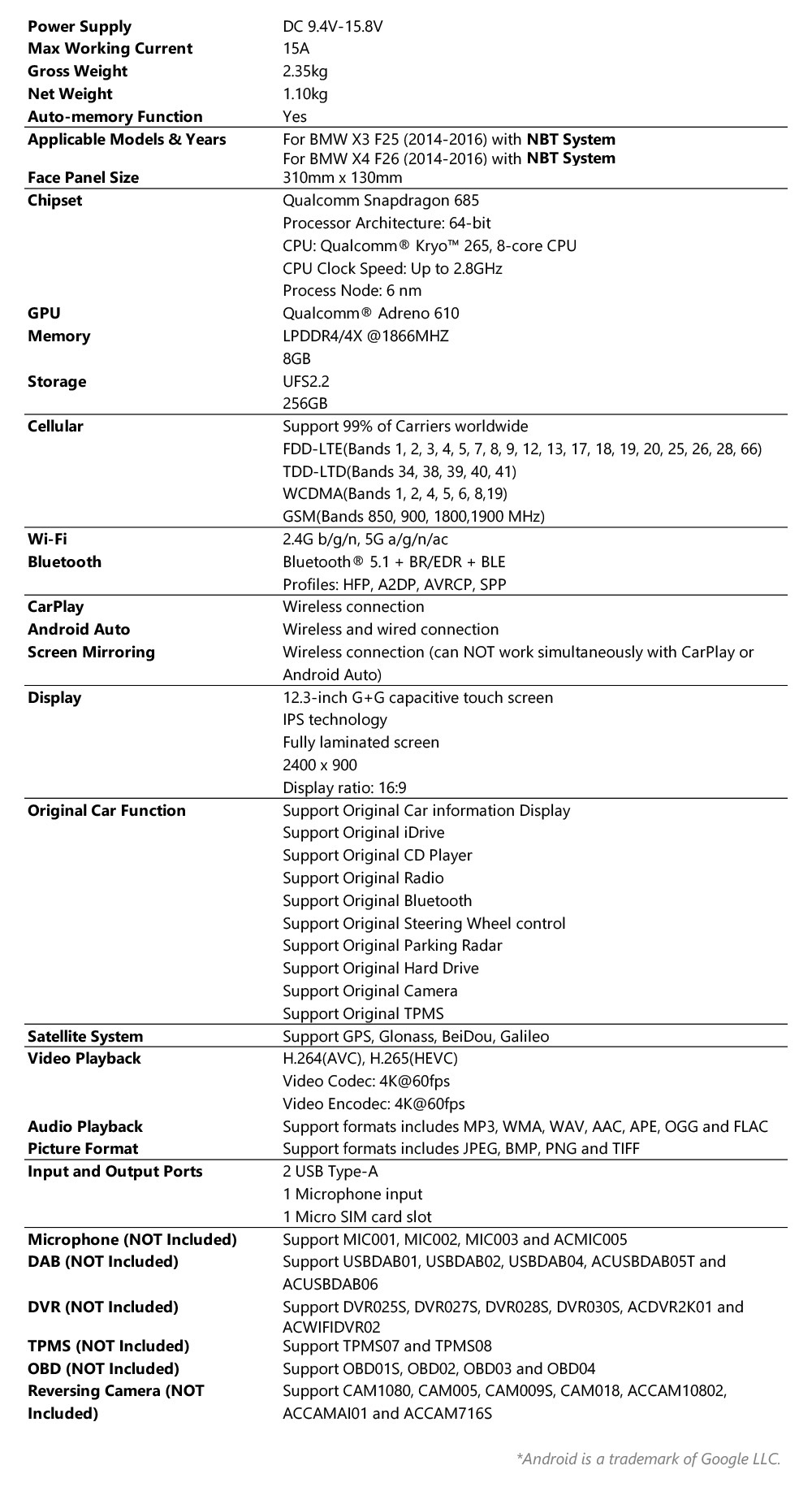 12.3 “十分に全体的な 4G ネットワーク、無線 CarPlay、フル装備のアンドロイド自動、NBT システムが付いている BMW X3 F25/X4 F26 のための 4K ビデオ プレーバック、注文適合を用いる作り付け QHD 2K IPS スクリーンのアンドロイド 14 のオクタ中心 64Bit Qualcomm 685 のプロセッサ 8GB + 256GB ROM 車のマルチメディアのナビゲーション・システム
