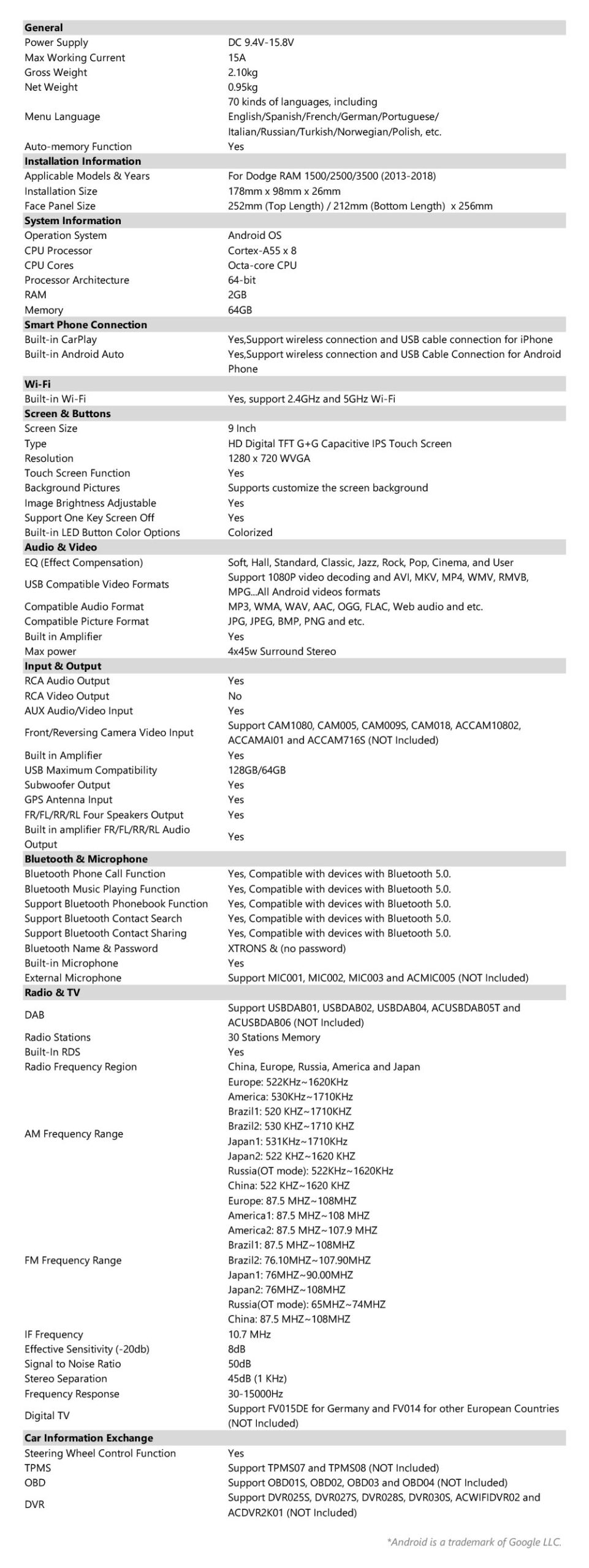 最適化されたアンドロイドOSオクタコア2GB RAM + 64GBソリッドステートROM 9″ デュアルバンドWi-Fi付き1280×720 IPSスクリーンカーステレオGPSナビゲーションシステム、RDS TCB001HQアンプ内蔵CarPlay&アンドロイドオート&SI4755ラジオ、ダッジRAM 1500 / 2500 / 3500のためのAHDカメラ、1080Pビデオ再生をサポートしています。