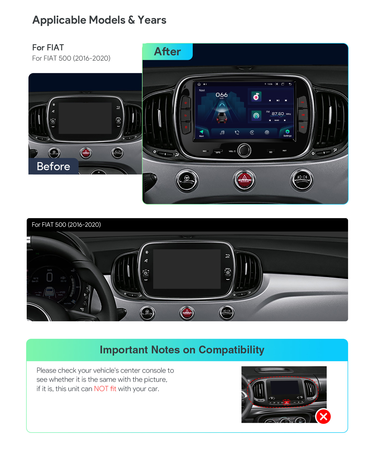 車のセンターコンソールをチェックし、非常灯ボタンが純正カーステレオのスクリーンと統合されているかどうかを確認してください - もしそうなら、このユニットはあなたの車に適合しません。画像をご参照の上、サポートチームまでお問い合わせください。
