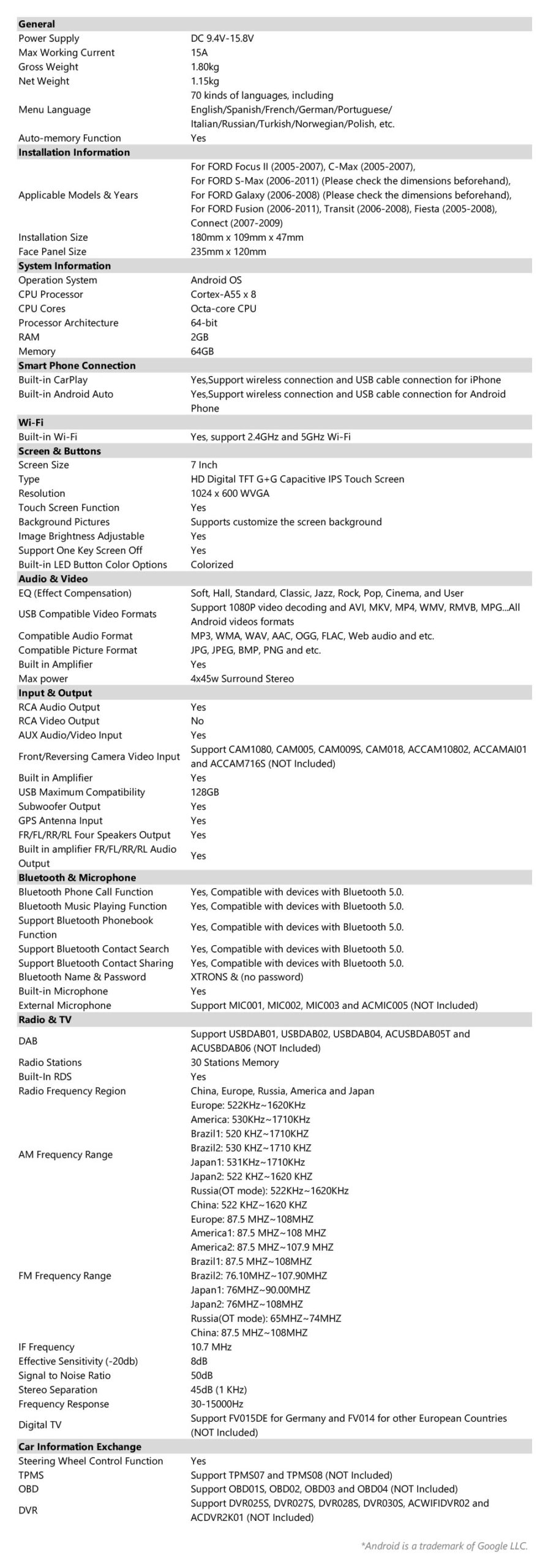 最適化されたアンドロイドOSオクタコア2GB DDR4 RAM + 64GBソリッドステートROM 7″ 1024×600 IPSスクリーンカーステレオGPSナビゲーションシステム デュアルバンドWi-Fi、RDS TCB001HQアンプ内蔵CarPlay&アンドロイドオート&SI4755ラジオ、フォードのためのAHDカメラ、1080Pビデオ再生をサポートしています。