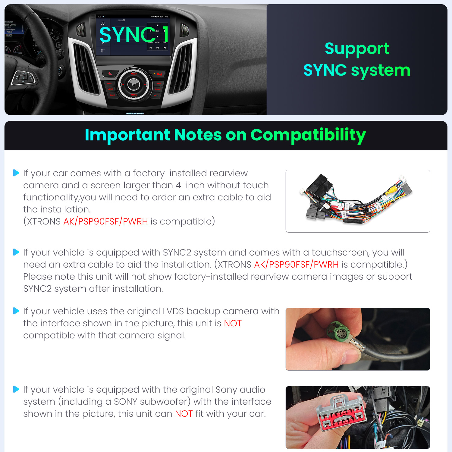 2. お客様の車両がSYNC2システムを搭載し、タッチスクリーンが付属している場合、インストールを補助するための追加ケーブルが必要となります。(XTRONS AK/PSP90FSF/PWRHに対応しています。)なお、本製品は取り付け後、工場出荷時のバックカメラ映像を表示せず、SYNC2システムにも対応しておりませんのでご注意ください。