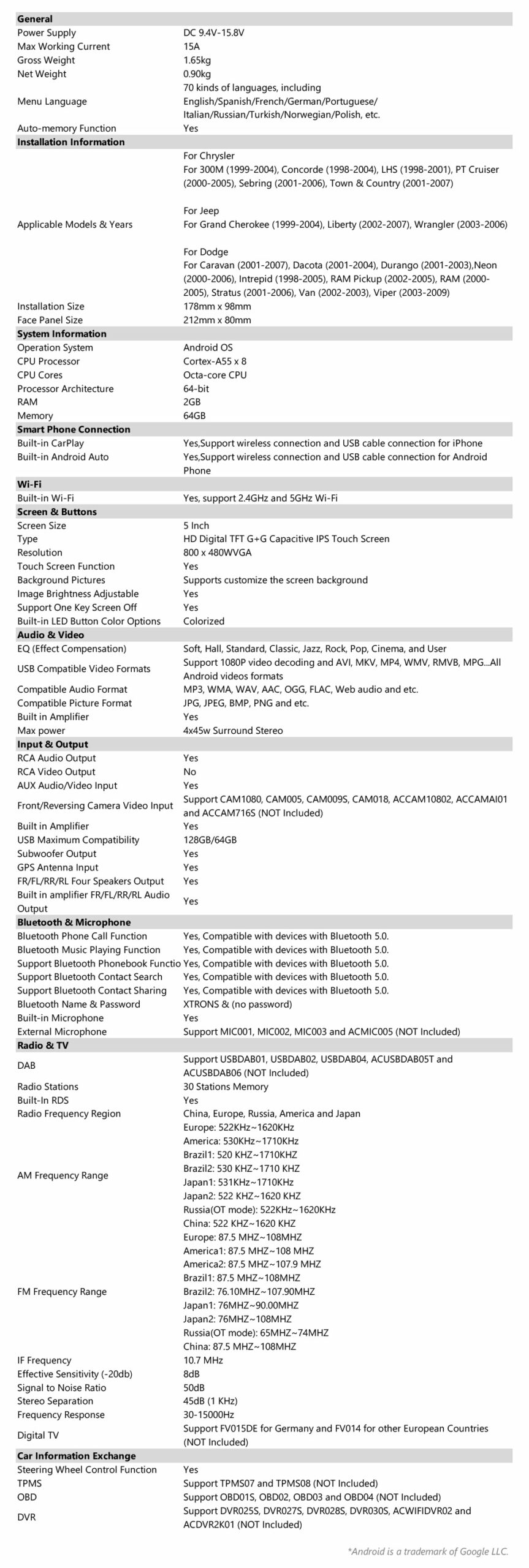 最適化されたアンドロイドOSオクタコア2GB DDR4 RAM + 64GBソリッドステートROM 5′ 800×480 IPSスクリーンカーステレオGPSナビゲーションシステム デュアルバンドWi-Fi、RDS TCB001HQアンプ内蔵CarPlay&アンドロイドオート&SI4755ラジオ、ジープ/ダッジ/クライスラーのためのAHDカメラ、1080Pビデオ再生をサポートしています。