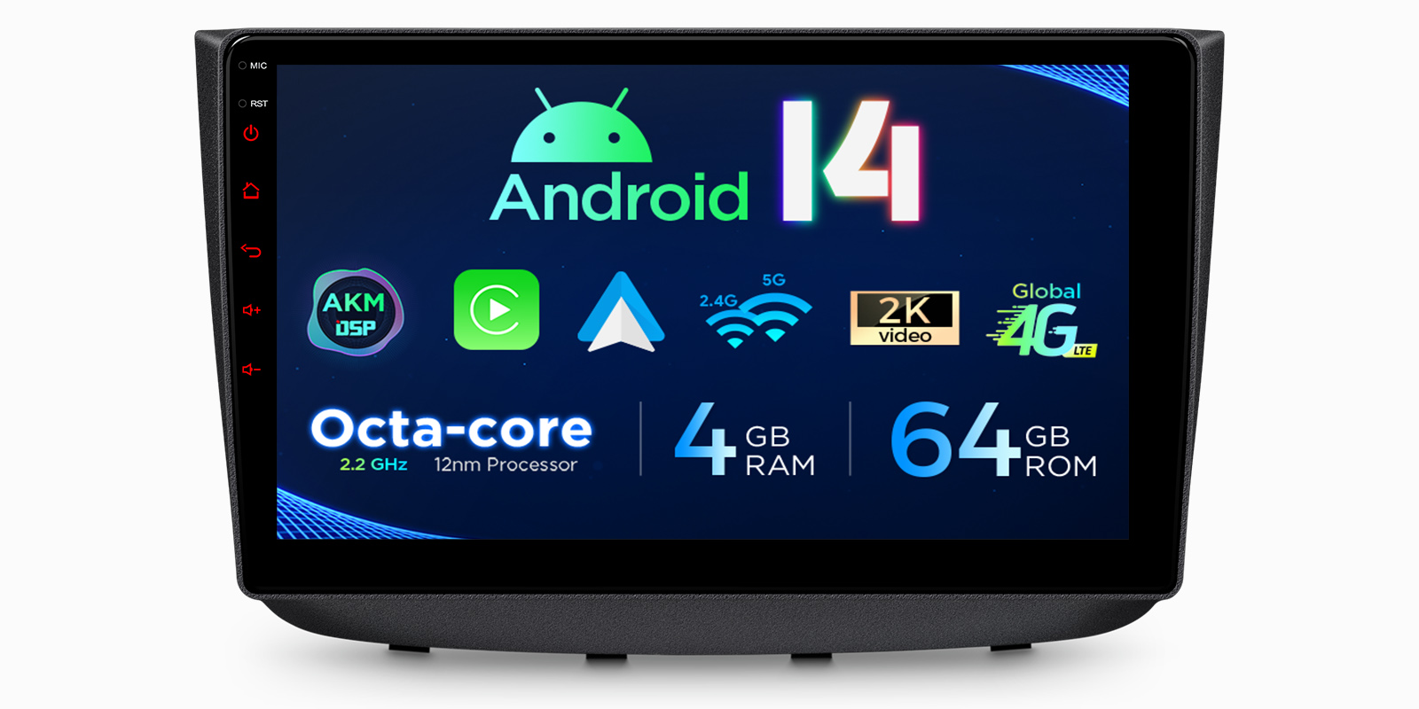 完全に刷新されたフレームワークで構築され、強化されたセキュリティとシームレスな操作を提供する最新のAndroid 14 OSを体験してください。4GBのRAMと64GBのROMを搭載し、マルチタスクに対応し、アプリやメディアをたっぷり保存できます。 比類のない安全性と流動性で、車内エンターテインメントを新たな高みへと引き上げます。