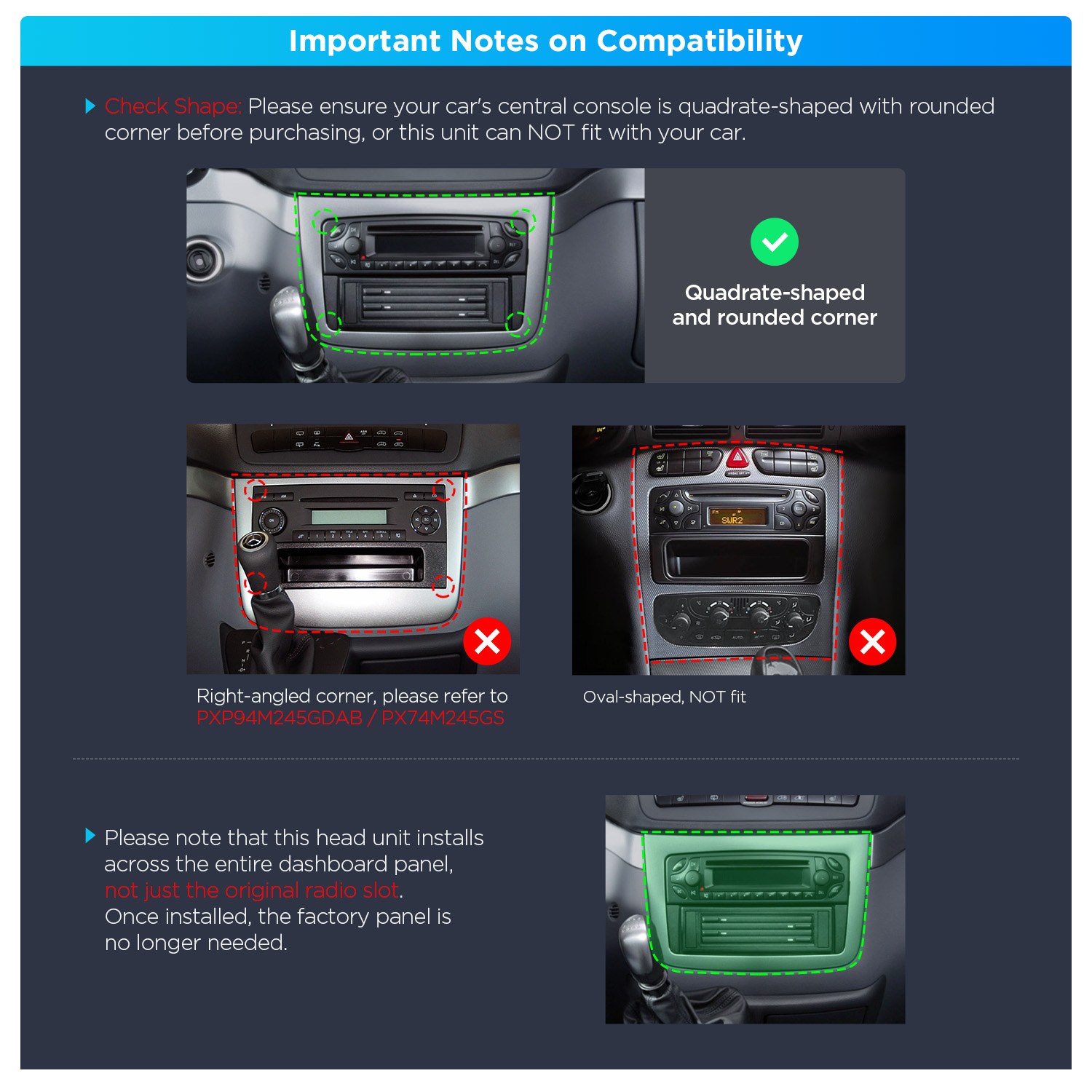本機が記載されている車両と互換性があることを確認するためにあらゆる努力を払っておりますが、ご購入前にお車の年式、寸法、センターコンソールの形状をご確認ください。