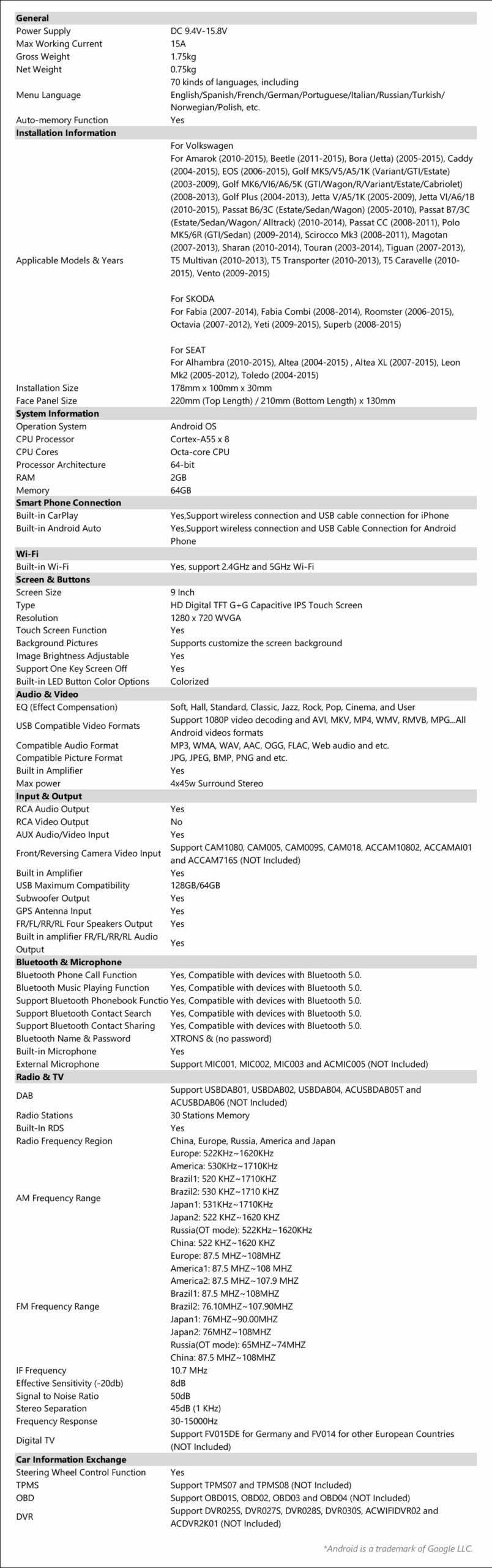 最適化されたアンドロイドOSオクタコア2GB DDR4 RAM + 64GBソリッドステートROM 9′ 1280×720 IPSスクリーンカーステレオGPSナビゲーションシステム デュアルバンドWi-Fi、RDS TCB001HQアンプ内蔵CarPlay&アンドロイドオート&SI4755ラジオ、フォルクスワーゲン/SEAT/SKODAのためのAHDカメラ、1080Pビデオ再生をサポートしています。