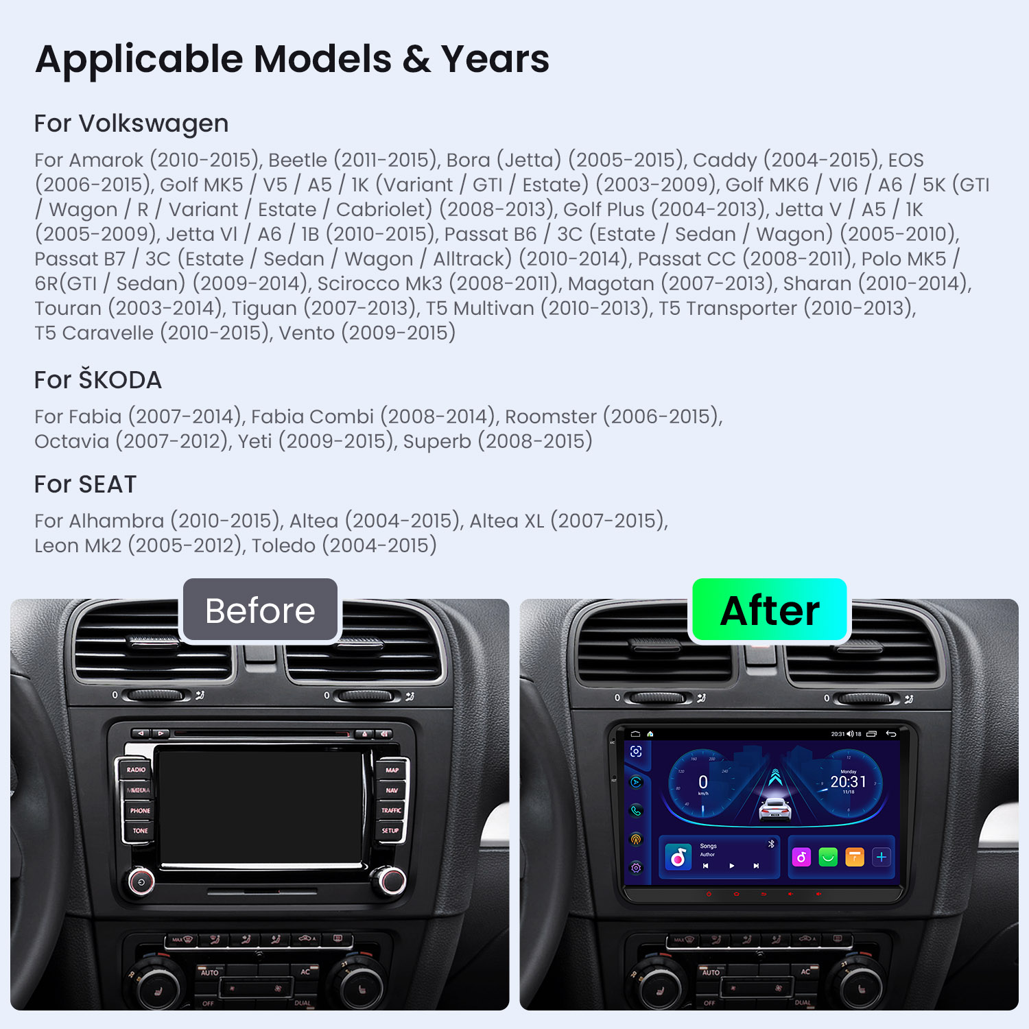 Amarok (2010-2015), Beetle (2011-2015), Bora (Jetta)(2005-2015), Caddy (2004-2015), EOS (2006-2015), Golf MK5/V5/A5/1K (Variant/GTI/Estate) (2003-2009)、ゴルフ MK6/VI6/A6/5K (GTI/Wagon/R/Variant/Estate/Cabriolet) (2008-2013), ゴルフ プラス (2004-2013), ジェッタ V/A5/1K (2005-2009), ジェッタ VI/A6/1B (2010-2015), パサート B6/3C (エステート/セダン/ワゴン)(2005-2010)、パサート B7/3C (エステート/セダン/ワゴン/オールトラック) (2010-2014), パサート CC (2008-2011), ポロ MK5/6R (GTI/Sedan)(2009-2014), シロッコ Mk3 (2008-2011), マゴタン (2007-2013), シャラン (2010-2014), トゥーラン (2003-2014), ティグアン (2007-2013), T5 マルチバン (2010-2013), T5 トランスポーター (2010-2013), T5 キャラベル (2010-2015), ヴェント (2009-2015)