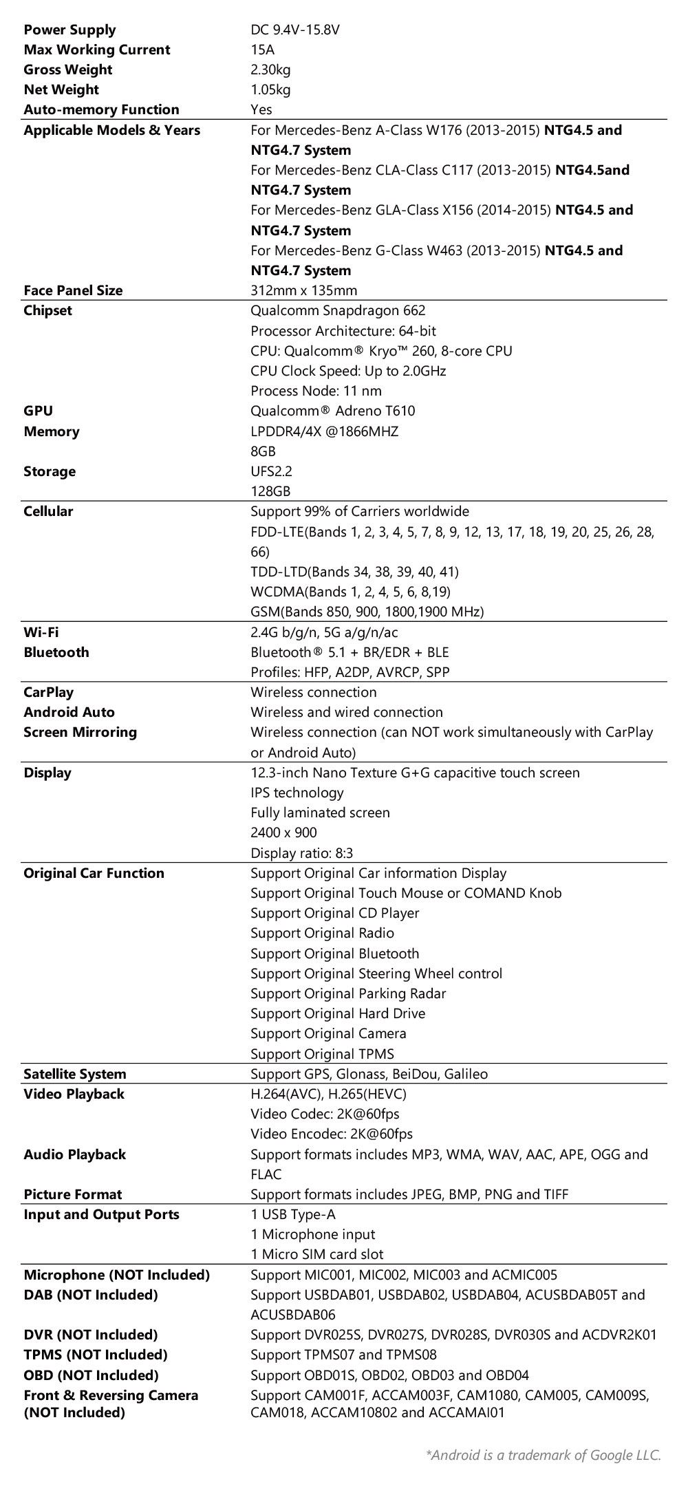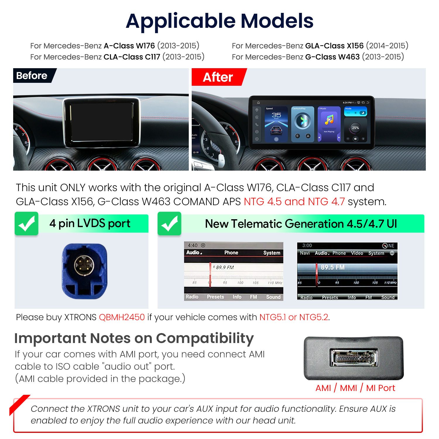 1.このユニットは、メルセデスベンツ純正のAクラスW176、CLAクラスC117、GLAクラスX156、GクラスW463 COMAND APS NTG 4.5およびNTG 4.7にのみ対応しています。ご購入の際は、純正システムがCOMAND APS NTG 4.5またはNTG 4.7であることをご確認ください。NTG 4.5/4.7システムは、通常4ピンLVDSポートと新しいテレマチックジェネレーション4.5/4.7 UIを持っています。